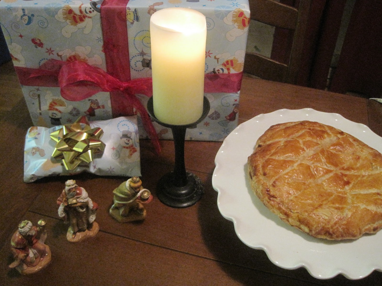 And so, a new tradition has been born! And I must say that I am beyond pleased with ourselves because of it. Yesterday, being the Eve of Epiphany, Emilia and I knocked ourselves out by making a (so very yummy) Galette des Rois. Or rather, we made the vanilla pastry cream the day before, and then I caused an enormous racket in the kitchen finishing it yesterday, while she was supposed to be taking her nap. (She just laid in her bed belting out Frosty the Snowman as loudly as she could.)